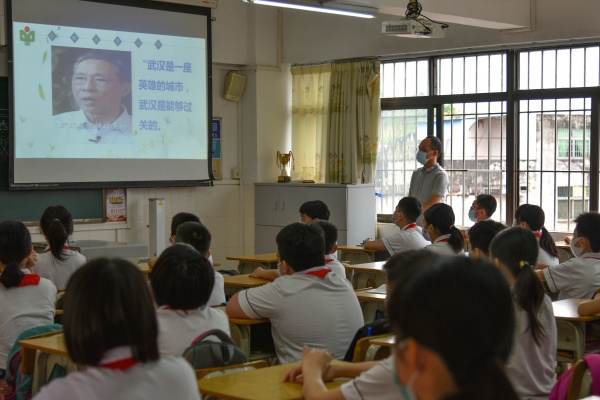 “复学第一课”,由陈惠良主任主持。首先是特别的升旗仪式。新学期第一面国旗,由六2班赵泳瑜爸爸赵权辉升起,赵权辉叔叔在疫情期间,一直坚持参加石岐区的志愿活动,他是一位热心家长,学校哪里需要帮忙,哪里就有他的身影。伴随着国歌缓缓响起,同学们庄严伫立,赵权辉的高大形象深深地印在了同学们的心中……