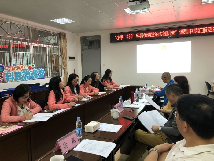本次活动由学校教学行政邓雁樱主任主持,分两个环节进行,一是在学校党建活动室进行课题中期汇报交流研讨,二是现场观摩五场“430”科普微课堂活动。