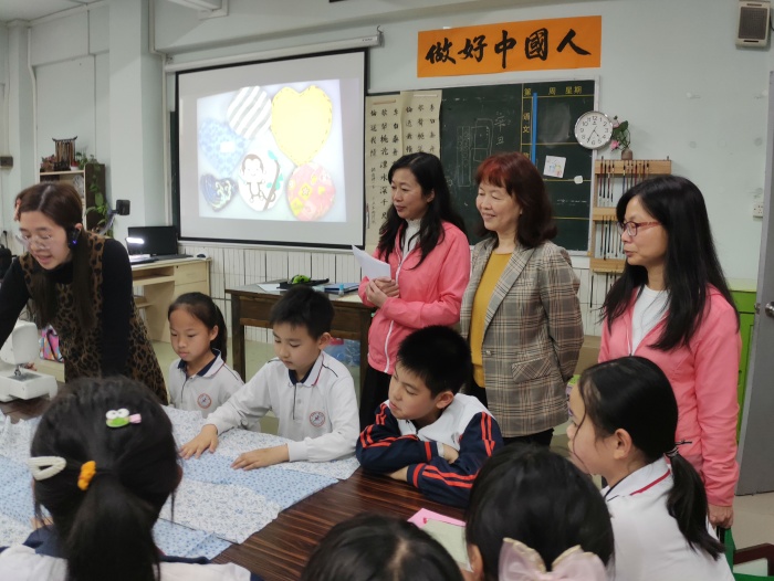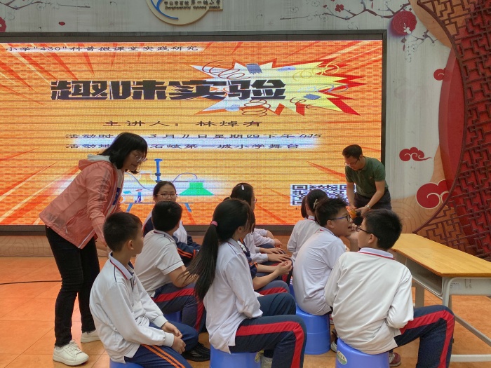 交流研讨会结束后,陈再玲主任在课题组成员的带领下,现场观摩两项课题研究成果展示橱窗及五场“430”科普微课堂活动。林焯有主任组织的“趣味实验”引领学生在实验中寻找科学原理,八名三(3)班的科普义工家长在马伟萍老师的组织下开展“垃圾分类就是新时尚”宣传体验活动,余秋蔚老师和陆丽瑜老师配合着中山市茶叶商会会长林瑞龙先生开展“身边的中草药之陈皮”讲座和体验活动,莫晴雯老师和拼布布艺老师郭静珊老师指导同学们开展“小天裁大学问”之“我要学织布”体验活动,蔡钰炀老师的剪纸小徒弟们在阳光书屋耐心地指导一群小同学陶醉在“妙手生花”剪纸活动中……
