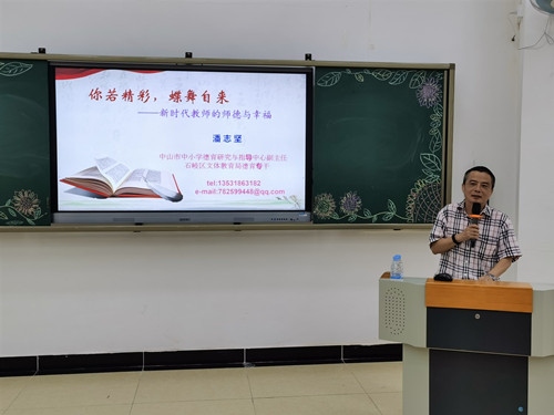 潘志坚为全体教师作《你若精彩,蝶舞自来——新时代教师的师德与幸福》专题讲座。潘志坚从“活在当下:教师的现实写照”、“且行且思:教师的理想定位”、“立德修身:教师的职业操守”、“幸福践行:教师的自觉追求”四个方面侃侃而谈,对新时代教师的师德与幸福进行了深入解读。他以一组“年轻教师忙碌的一天”漫画呈现当前中小学教师的现实写照,启发老师们思考:星空体育每天从事的教育教学工作的本质是什么?什么是教育?教师做什么?希望教师们学会微笑、学会表达、学会亲近、学会倾听、学会沟通、学会感受、学会发现,努力修炼教师的人格魅力,做一个具有坚定的政治方向、高尚的个人品德、稳定的心理品质、良好的行为习惯、向上的社交能力、高雅的审美情趣的魅力型教师。“教者有梦,师者有理”,潘志坚认为,教师首先是幸福生活的热烈追求者,有理想信念的教师是幸福的教师。他带领老师们一起重温“习总书记对新时代教师的定位”和“新时代中小学教师职业行为十项准则”,鼓励老师们用实际行动诠释着师德师风的真正内涵,做心中有爱的筑梦人,做学生健康成长的价值引领者和心灵关怀者,以良好的师德共同撑起教育的蓝天。
