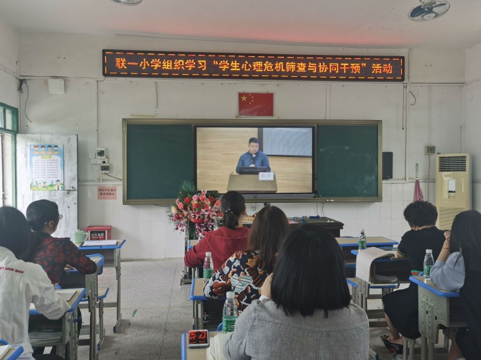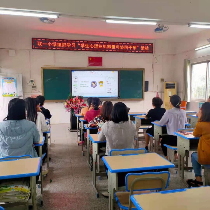 为贯彻《广东省中小学心理健康教育行动计划》关于“完善学生心理危机预防、预警、干预工作体系”的工作要求,落实《中山市儿童青少年心理健康三年行动计划》中“编织精准计时的心理健康预警网络和构建稳妥有力的心理健康干预机制”任务,促进学生身心健康,建立和谐校园。2021年3月18日上午,中山市坦洲镇联一小学全体班主任及心理教师直播观看中山市中小学“学生心理危机筛查与协同干预”主题研讨活动。