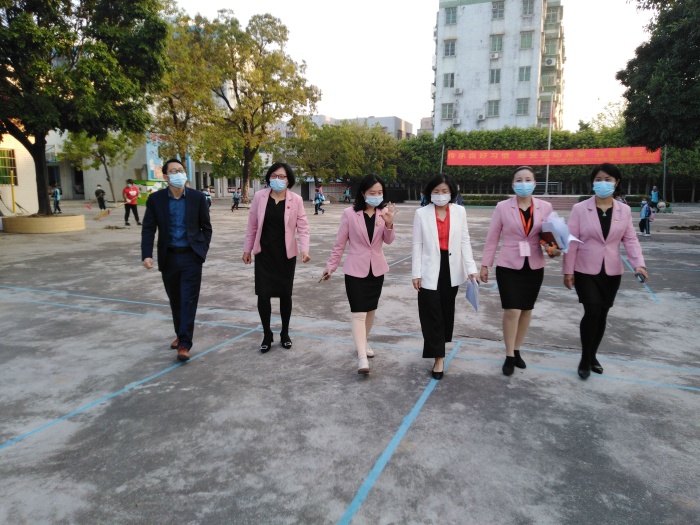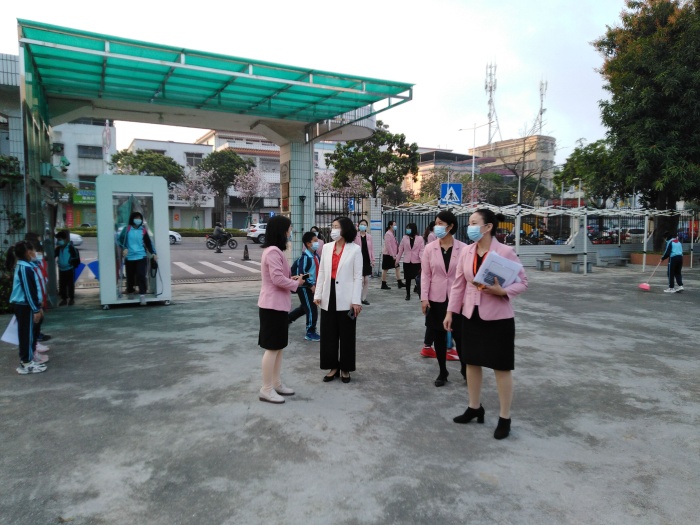 在坦洲镇教育和体育事务中心张志略主任的陪同下,坦洲镇党委委员温晓虹7时10分就来到了联一小学了解开学情况并就开学各项工作作指导。校长潘虹、副校长陈丽娥、德育主任甘群带、总务主任白雪梅和办公室主任肖素华陪同一起巡视校园。