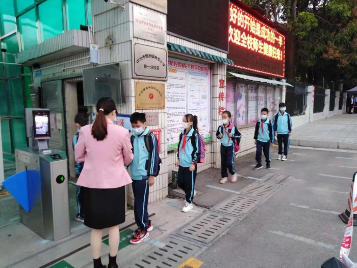 温委员入校前主动配合保安测试体温。询问门口人脸识别闸机和寒假初广东鑫光智能系统有限公司赠送学校测温一体柜的使用情况。关切询问学校防疫物资的准备和开学第一天师生的返校情况,还有目前班级人数,并到教室实地查看是否宽敞,能否让学生坐得舒服。不时亲切地弯腰或蹲下询问学生的返校心情,假期有没有完成老师布置的作业等,言语间充满关爱。在党和政府的关怀下,联一小学的全体师生倍感幸福。