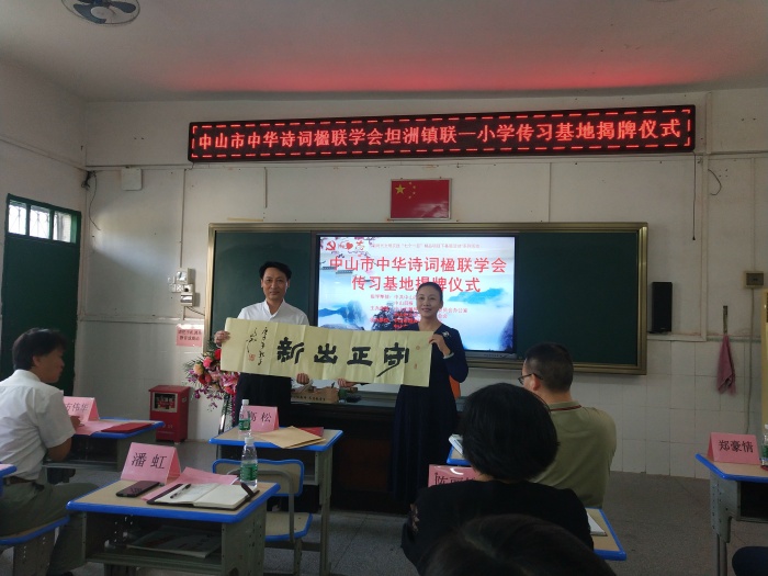 在热烈的掌声中,领导与嘉宾走上主席台,一起揭开联一小学“中山市中华诗词楹联学会坦洲镇联一小学传习基地”牌匾的帷幕。中华诗词楹联文化正式走进联一小学的校园,高松主席还给坦洲镇联一小学赠送了“守正出新”的珍贵墨宝。
