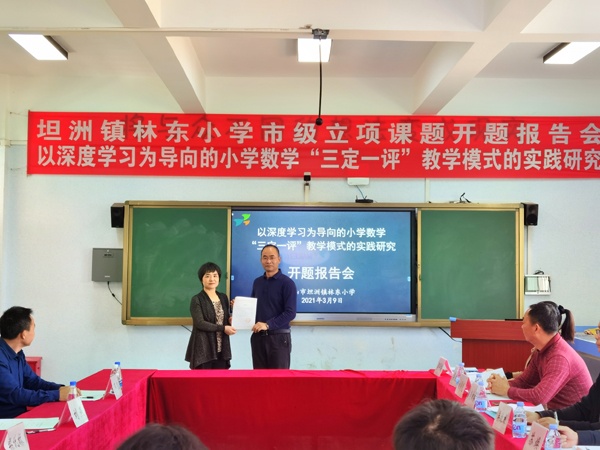 2021年3月9日下午,由林东小学肖相桥老师主持的中山市教育科研立项课题《以深度学习为导向的小学数学“三定一评”教学模式的实践研究》开题报告会在坦洲镇林东小学创客教室举行。