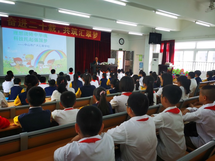 为扎实而有效地开展《爱党爱国爱科学,争当新时代好少年》主题教育活动,培育新一代有梦想的青少年,中山市广大汇翠学校特邀坦洲镇关工委“五老”讲师团成员之一的李桂华老师到校进行《理想浇铸中华魂,科技托起强国梦》主题教育讲座。