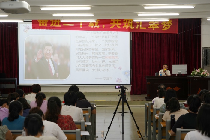 潘主任着力从“立德修身,教师的职业操守”方面给老师们带来了心灵上的洗礼。潘主任将师德拆分为“师有理,德有道”,一是希望老师们要有教育理想,不断地给自己提出追求的目标,保持激情;二是恪守师道,大道于行。牢记习近平总书记对新时代教师的定位,争做“四有”好老师,争做学生“引路人”,自觉践行“四个相统一”;牢记新时代中小学教师职业行为十项准则,做心中有爱的筑梦人。