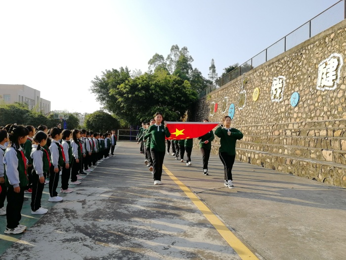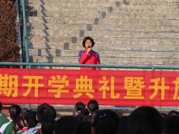 上午8:30分,全校师生排着整齐的队伍来到学校篮球场参加开学第一次升旗仪式暨开学典礼。升旗仪式上,全体师生肃立,少先队员行队礼,高唱着国旗,注视着冉冉升起的国旗,心潮澎湃。