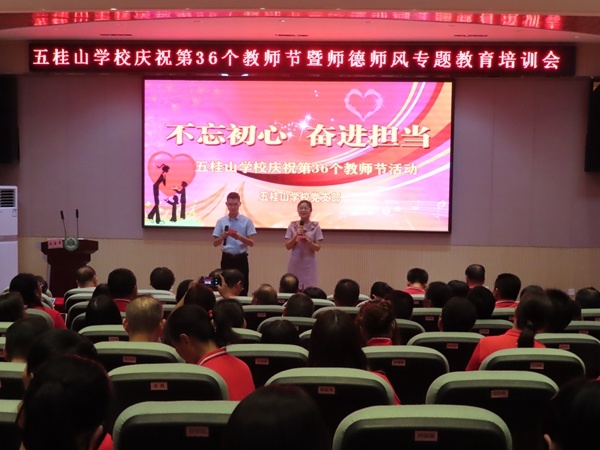 9月10日下午,五桂山学校党支部庆祝第36个教师节“不忘初心,奋进担当”主题活动暨师德师风专题教育培训会在综合报告厅隆重举行。五桂山党工委副书记、人大工委主任李佳利,五桂山教育事务指导中心主任张立功及离退休教师代表和学校全体教职工参与本次活动。