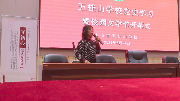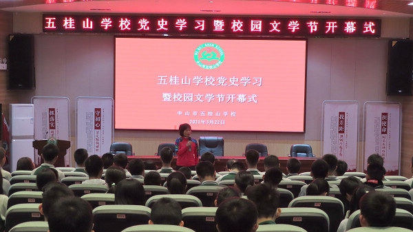 2021年3月22日清晨,春风细雨,绿意盎然。五桂山学校以“四月芳菲 书香校园”为主题的文学节开幕式正伴着“学习党史”的升旗仪式庄严肃穆地举行。中山市离退休干部宣讲团成员、中山市委党史研究室原主任郭昉凌应邀为师生们讲述“五桂山为什么是英雄的五桂山”的故事。前来参加活动的还有中山市老干部局宣讲科王嘉述科长、市红十字会传统文化保育与传承志愿服务队队员。