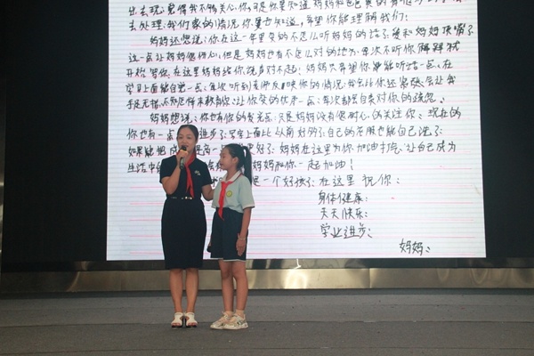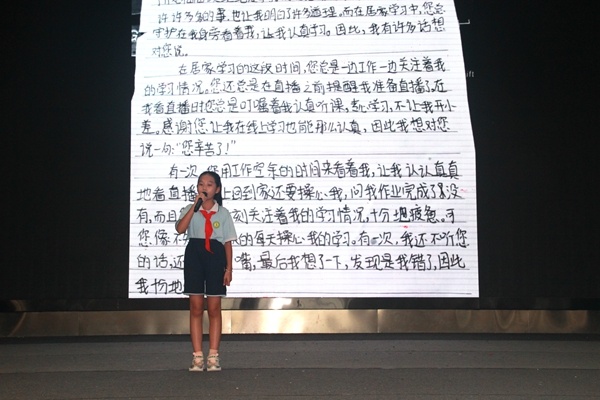 仪式第二部分,进行了少先队抗疫诗歌展演,诵声琅琅,字字铿锵,表达了队员们感恩前线战士的付出,要珍惜生命,努力学习。其后是亲子传情环节:凌厅同学和她的妈妈心语对话,情真意切,感人至深,现场还播放了家长对孩子们想说的话,以及孩子们想对爸妈说的话视频,家长们悠悠叮咛,声声鼓励;孩子们纷纷表示在校做个好学生,在家做个好孩子,努力学习,天天向上。