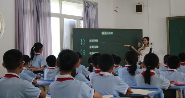 首先,胡柳老师和五(2)班学生上了一节《图形的旋转》。胡老师通过生活中的旋转现象:例如闹钟的时针,风扇、风车的转动,旋转木马的旋转等等,引入新课——图形的旋转。课件上出示了一根指针和一只小熊,胡老师提问:“哪位同学能说出明确的指令,使指针一下子指向小熊?”进而引出旋转的三要素,旋转中心,旋转方向,旋转角度。课堂上学生踊跃回答,学习气氛浓厚,语言表达也很清晰。整节课时间把握得当,教学环节设计合理,获得了大部分老师的好评。
