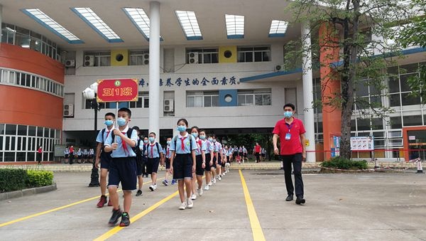 日幕时分,和风吹送,愉快充实的开学第一天结束了。校门外家长们有序地等待孩子放学;校园内,同学们分年级,站好队,在班主任老师带领下,做好错峰放学的准备。孩子们放学后,各班正副班主任在教室进行全面消毒。让学生们不仅要把一天的快乐带回家,更要把健康和安全带回家。