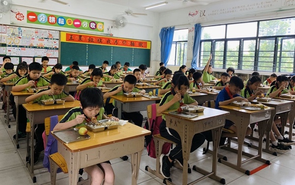 “食无语,食无余”。午餐时间到,食堂工作人员提前把午餐打包好,运送到各班的课室门口。学子们在班主任的带领下,做好就餐前的各项准备。分批洗手、错峰排队领餐盘、在教室吃饭,一切有条不紊的进行,学子们享受着午餐的愉快时光。用餐后,学子们有序的清理好桌面,班主任有序的给孩子进行体温测量,安静午睡。