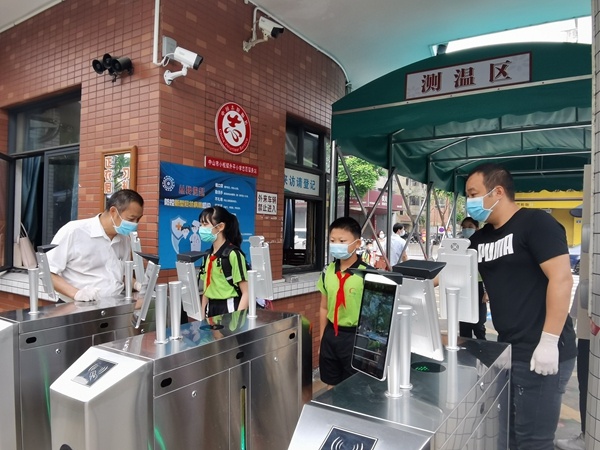 学校为学子们返校复课精心做好了各种准备。在校门口,学生们按照划定好的测温通道,间隔一米有序排队,在接受体温检测、身份核实后方可入校。同时,为了防止学生发生聚集现象,实行分年段错峰上下学。园内粘贴的路线指引示意图、站位点、指示牌、温馨的提示语清晰可见,确保进校后学生“精准分流”。