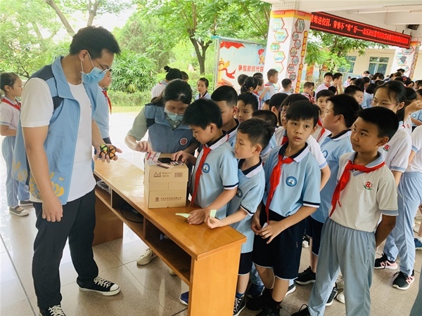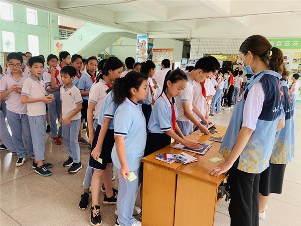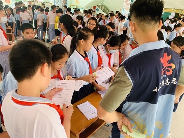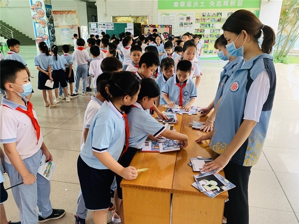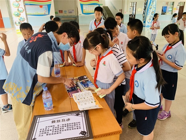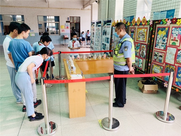 上午第一节课下课后,北区小学大堂人声鼎沸,由社区组织的禁毒宣传知识摊点小游戏在正如火如荼地开展着,学校三至六年级的学生分批参加各个摊点的小游戏,通过小游戏认识毒品、学习毒品知识,现场还设置了禁毒宣传展览,向学生形象地展示了真实的毒品是什么样的。各个摊点的小游戏更是趣味与知识相结合:乒乓球投篮,学生要认识球上面的毒品名称并投进相应的篮子为挑战成功;禁毒知识问答,学生要答对答题卡上五道与禁毒知识有关的题目,学会分辨毒品;蛛丝马迹,学生需要找出藏在书桌里的毒品或吸毒用具,并说出物品的名称或使用方法,即为挑战成功;还原真相:将桌上打乱的图拼好,并说出物品的名称。