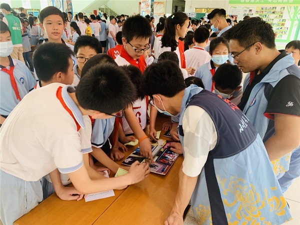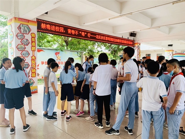 为进一步推进学校禁毒宣传工作的普及,充分发挥学校教育在毒品预防教育活动中的重要作用,使广大学生认清毒品的危害,进一步增强防毒、拒毒意识,确保“学生不涉毒、校园无毒品”,在6.26国际禁毒日来临之际,北区小学联合北区社区开展“禁毒进校园,青春不毒行”禁毒预防宣传教育进校园系列活动,6月24日上午,由社区组织的禁毒宣传知识摊点小游戏在学校教学楼一楼大堂拉开帷幕。
