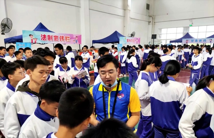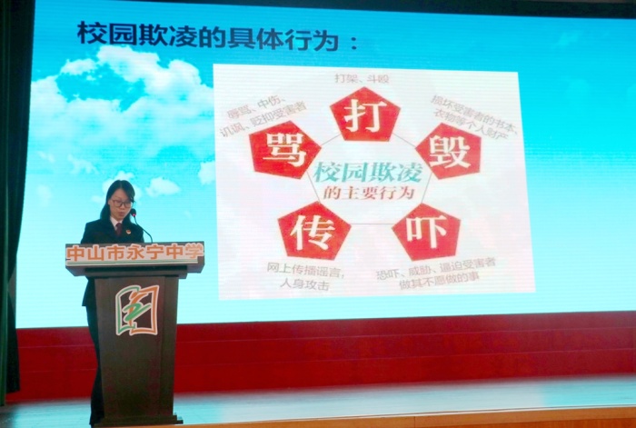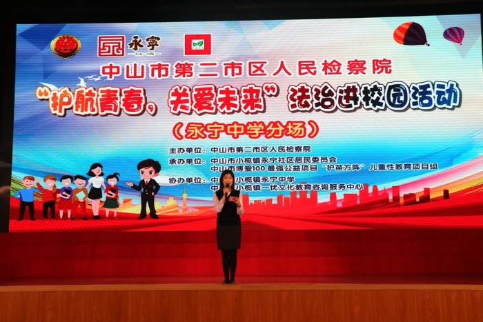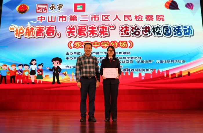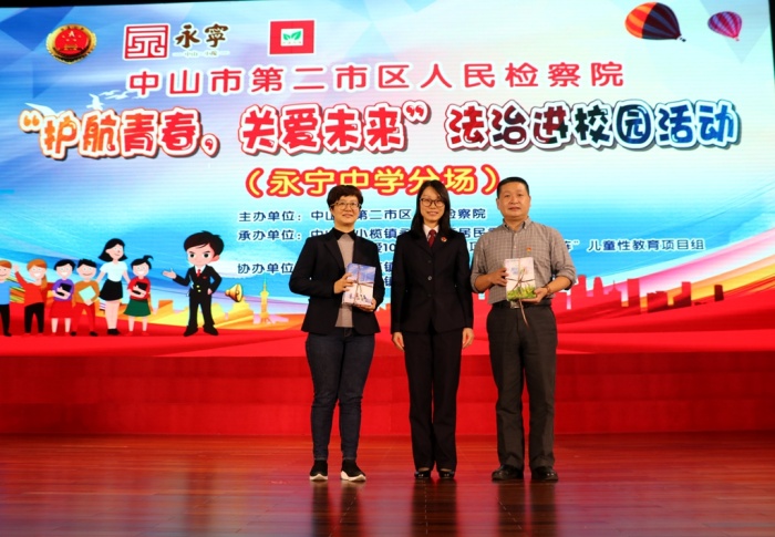 本次普法活动以主题讲座与摊位游戏结合的形式进行,活动中永宁中学陈清茂校长向中山市第二市区人民检察院二级检察官邓艳女士颁发法治副校长聘书,邓艳检察官代表中山市第二市区人民检察院分别向永宁社区居委会、永宁中学赠送《用心关爱,呵护成长》法治进校园书籍。邓艳检察官为师生作了《向校园欺凌SAY NO!》精彩的专题讲座;随后师生们参加了“法治进校园”游戏互动嘉年华活动。