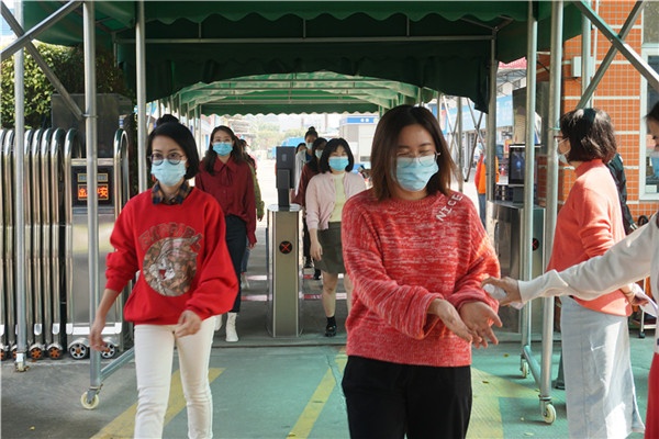 上午11时20分,在学校疫情防控工作领导小组的指导下进行了演练;洪智跃主任一声令下,演练开始了。在学校门口进行了进校晨检演练,安保人员及值日教师按开学后的工作要求上岗,教职工佩戴口罩从正门进入校园,人与人之间保持一米距离,依次完成测温、手部消毒;筛查出发热或疑似发热人员,及时进行妥善处理。