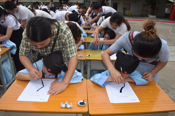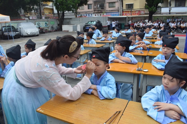 本次“开笔礼”仪式包括:正衣冠、礼拜先师、敬谢父母、敬拜师长、朱砂启智、书字明理、击鼓鸣志、经典立志等多个环节。