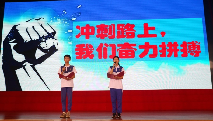 然后,初三4班张晴晴同学和初三6班的揭光锟同学激情澎湃的朗诵了《冲刺路上,星空体育奋勇搏击》——“脚踏实地,苦战百日,争分夺秒,放飞梦想。豪情满怀,绽放六月,你追我赶扬风帆,再创永中新辉煌!冲刺一百天,星空体育写就华丽篇章!” 这响亮的声音,由衷吐出了全体初三同学的切切心声!