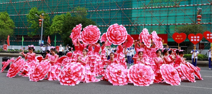 永宁中学“红心向党”花开盛世花伞巡游队是一支特别引起观众关注的创新巡行方队。他们舞动手中的花伞,举着“善行换积分、积分换快乐、学党史、心向党、知党恩、跟党走、为党育人、为国育才、立德树人”等彩旗和标语,高喊着“阳光自信、励志勤学、博爱善良”的口号,引来了沿途观众的阵阵掌声和喝彩。最引人注目的是答谢台前,同学们化着彩妆、手持花伞、翩翩起舞、舞蹈造型盛世花开。同学们仪态大方、着装典雅、亮丽清新,舞蹈既展示了优美的中华古典文化,又体现了永中人大爱涌动的情怀,既弘扬了中华博爱精神又融入了永中公益元素,赢得了现场领导、嘉宾观众的阵阵掌声。他们撒播了一个个爱心、收获一次次感动,充分彰显出永中人的大爱情怀和澎湃激情。