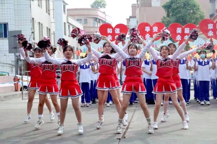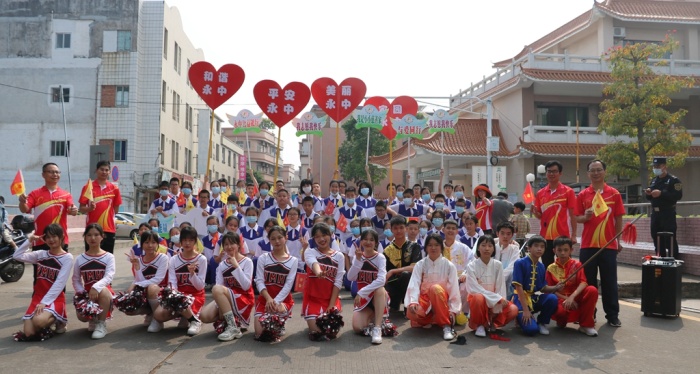 在慈善万人行巡游深涌桥面上的助兴点,有一块“牢记嘱托跟党走,永中奋斗新征程”的宣传版,展示着永宁中学的办学宗旨、办学理念、育人目标、办学特色等内容,这就是永宁中学“红心向党”啦啦队为慈善万人行巡游活动呐喊助兴的舞台。这支队伍是一支充满青春活力、团结协助,具有阳光自信、励志勤学、博爱善良品质的特色啦啦队,共有师生72人,主要表演武术、啦啦操和花开盛世舞蹈,为巡游队伍呐喊助兴,他们举着“和谐永中、平安永中、美丽永中、家园永中”心型主题标语和宣传永中公益银行及宣传公益活动的小KT版标语,展示永宁中学教育教学特色。当天清晨的小榄,略带寒凉,但大伙的心却是亮堂的、炙热的、温暖的。