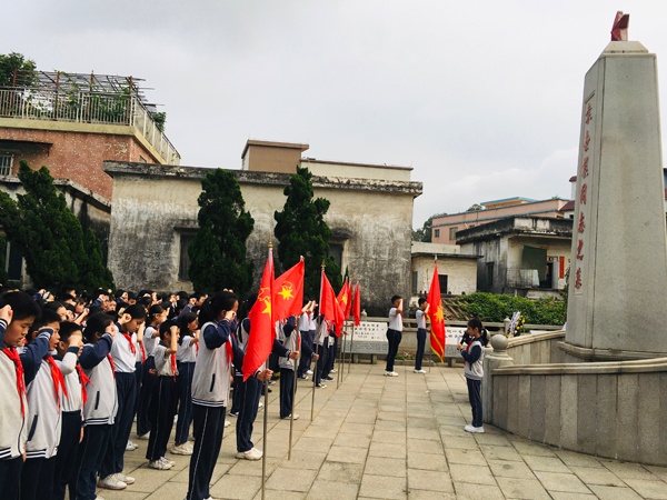 上午9点,同学们排着整齐的队伍,怀着无比崇敬的心情,来到海洲村袁世根烈士墓。活动先由大队长出大队旗,学生们齐唱少年先锋队队歌,接着由大队辅导员介绍袁世根生平简介及先进事迹并宣布活动开始。少先队员代表为革命烈士献词、献花,全体师生向革命烈士默哀,并在烈士墓前进行了集体宣誓。最后由德育处主任王旷为大家作总结讲话,号召全体同学要向革命先烈学习,热爱祖国,拥护中国共产党,做修身励志好少年。