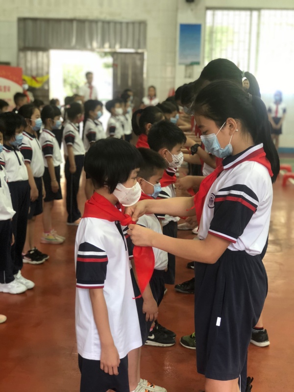 队员们穿戴整齐,佩戴好口罩,怀着欣喜和好奇,按照间隔1米的距离在礼堂里安静地坐好。在大队长:“出队旗,敬礼!”的口令声中,仪式开始。《中国少年先锋队队歌》鼓舞着队员们。在大队委员会的委员宣读组建新中队的决定后,伴随着《红领巾飘起来》的欢快曲调,四、五、六年级的大队委哥哥姐姐们为一年级首批入队的新少先队员们授红领巾。胸前飘扬着鲜艳的红领巾,新队员的脸上满是骄傲与自豪,在大队辅导员李锐翀的带领下庄严宣誓,为共产主义事业贡献力量!少工委副主任陈桂芳副校长给一年级三个中队的中队辅导员颁发聘书,一年级三个新中队建立了!陈校长对新队员表示衷心的祝福,并对他们提出希望:好好学习,锻炼身体,长大以后成为对社会有用的人!久久回响的“时刻准备着”的呼号应答声为入队仪式拉上帷幕。
