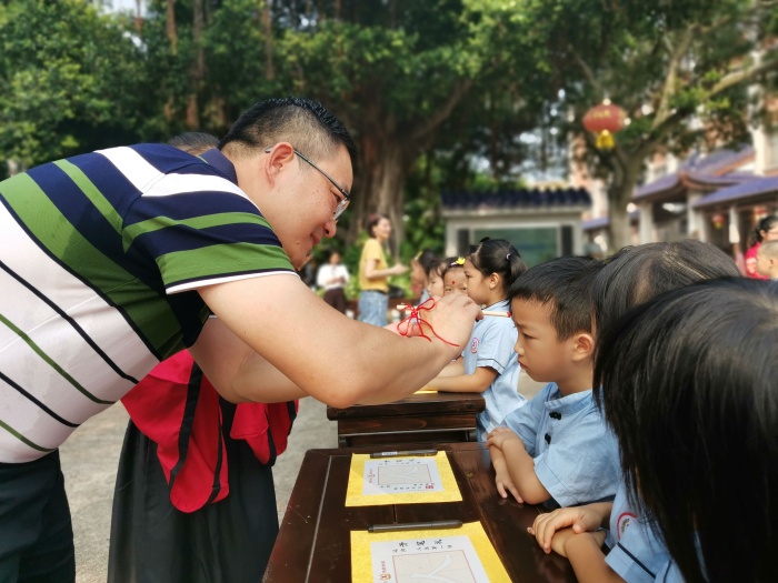 “开笔礼”活动在烟洲书院举行,烟洲小学131名一年级新生及其家长参加了此项盛典。孩子们怀着无限的憧憬和期待,在老师们和家长们的引领下,在拥有147年历史的烟洲书院中开启了人生的新篇章。“开笔礼”在副校长杨志坚敲响的钟声中拉开了帷幕,活泼可爱的孩子们认真聆听了校长黄文华的对他们的谆谆教诲,接着在悠扬的传统音乐声中,老师们为全体孩子“朱砂启智”,寓意孩子们能够开启智慧,从此耳聪目明、心灵手巧。然后就是家长们认真地教孩子们书写“人”字。以“人”开笔,寓意着孩子从小就要认识到学会做人的重要性,将来做一个顶天立地的人。“人”字写好后,孩子们由家长领着缓缓走进庄严神圣的烟洲书院参拜万世先师孔子。罗勇志老师带领全体学生整理衣冠,诵《弟子规》(节选),三拜圣人孔子,三击鼓明志,三位学生代表向老师敬茶,这些都寓意着学生们要尊师孝亲、崇德立志、仁爱处世的中华传统文化精髓,树立“善 ” “正 ”行为规范,汲取尊师爱学的思想精华。最后,何彩云老师代表全体老师作了发言,表了决心。
