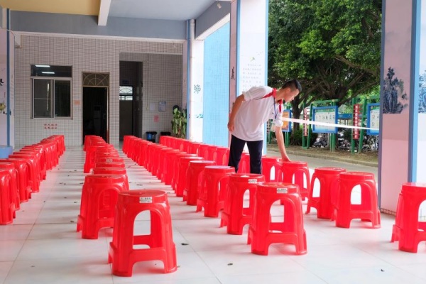 30名优秀学生干部穿着统一的校服,早晨不到七点就到达考点,听从安排和接受任务。七点整,志愿者们光荣地将 “考点引导员”的工作牌挂在脖子上,一天的志愿服务工作正式拉开序幕:跑道上,一个个白色身影穿梭着为考生们发放准考证、拿好号码服;跳远场地,志愿者拿着被太阳晒得热辣辣的铁楸把沙池填平;铅球场上眼疾手快地为考生们捡回铅球;篮球场上,来来回回把考生带到固定候考点;跳绳场地,志愿者们协助裁判老师们记录成绩、摆放跳绳。他们挥汗如雨,及时传递着一张张信息表……