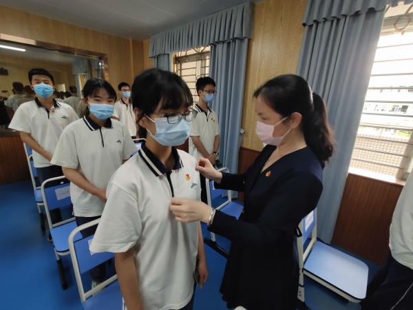 仪式开始,奏唱国歌。集体入团仪式严格按照标准化入团流程进行,全体新发展团员隔空共同唱响庄严国歌。随后莫秀红副校长宣读新团员名单,此次入团80名同学,他们是通过自主申报、资格审查、班主任推荐、学业成绩考核、团校培训考核等综合考察才获准加入中国共产主义青年团的。接着,初三年级班主任、老团员为初三年级的新团员颁发团员证和佩戴团徽,初二年级的新团员由家长颁发和佩戴,全体团员线上同步面向团旗进行了庄严宣誓。