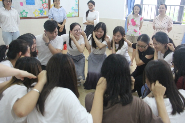 活动中,刘老师幽默风趣地进行自我介绍,然后以轻松愉快方式引领全体教师进入游戏环节。 游戏开场是“我说你做”。刘老师让老师们打开右手食指和大拇指跟着她做,然而她把手势放在额头上,有的老师的手势却是放在下巴下,老师们不知所措,听到的是放额头上,但是讲师自己却放在下巴下。刘老师告诉大家:看到的不一定是真相,要相信自己听到的。接着,又进行了“左手抓、右手放”和“鸡蛋变凤凰”等游戏,刘老师通过多个快乐的游戏活动,引导老师们一步步释放自己的心理压力,展现真实的自我,置身于活动中的老师们都开怀大笑。