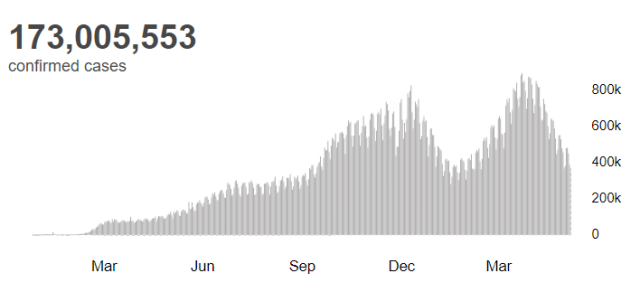 根据世卫组织最新实时统计数据,截至欧洲中部夏令时间6月7日16时55分(北京时间6月7日22时55分),全球累计新冠肺炎确诊病例173005553例,累计死亡病例3727605例。7日全球新冠肺炎确诊病例新增368456例,死亡病例新增8661例。