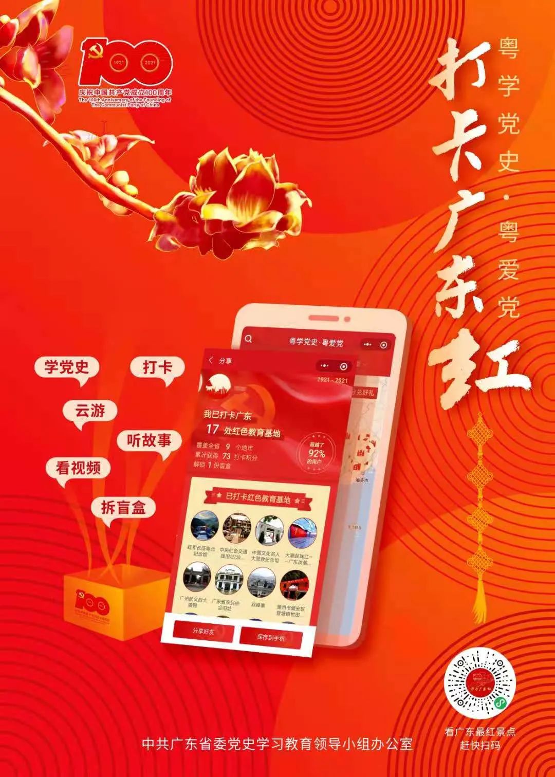 广大党员干部群众随时随地拿起手机扫描二维码或在微信小程序搜索“打卡广东红”,即可进入页面,通过线上或线下实地打卡等方式,马上进入上百个重要地标、重要革命遗址、重大事件发生地、革命纪念馆等参观学习,或看或听,或进或出,轻松自如。