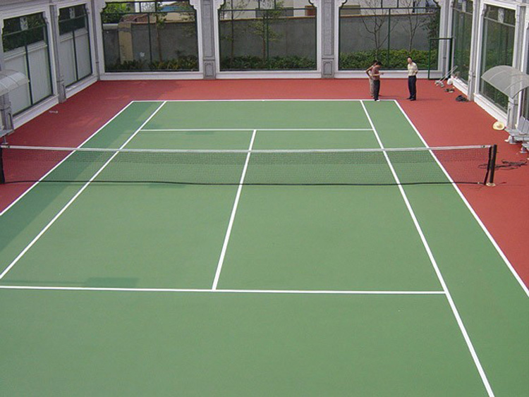 材料简介:丙烯酸树脂球场(弹性丙烯酸网球场,硬地丙烯酸网球场)适用于专业选手比赛和训练使用,由100%纯丙烯酸乳液加入进口色料及助剂制成,完全符合环保要求,具有较好的耐磨性能,防水、防晒、防滑、可铺设于室内外沥青或水泥面上。可依照加砂及水的配比调整表面糙度。中级性能产品。