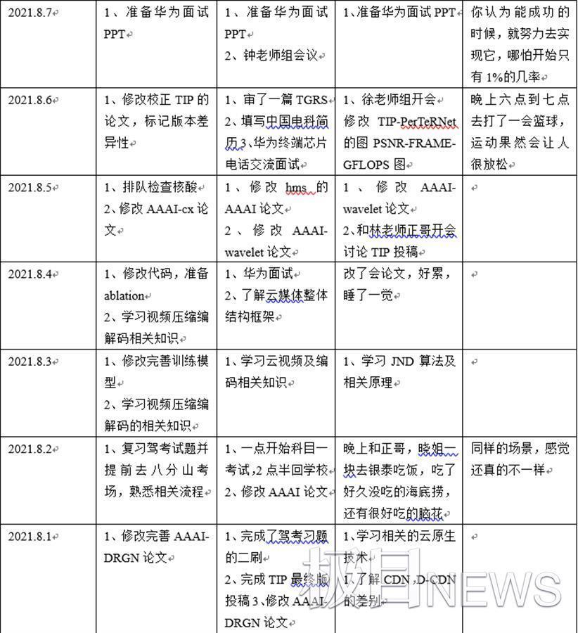 “我在完成一篇论文的时候,已经在写下一篇论文了,同时还在做下下篇论文设想验证。这样时间是连续的,形成一个闭环,中间不会有空窗期。而且还可以及时发现存在的问题,互补优化。”江奎说,他每天都会把所有需要完成的事情按照重要程度排序,细分到每一天的早、中、晚,合理分配在自己的时间记录表里。每天晚上,他会对照时间表进行总结,查找遗留问题,并记录一些自己的想法。