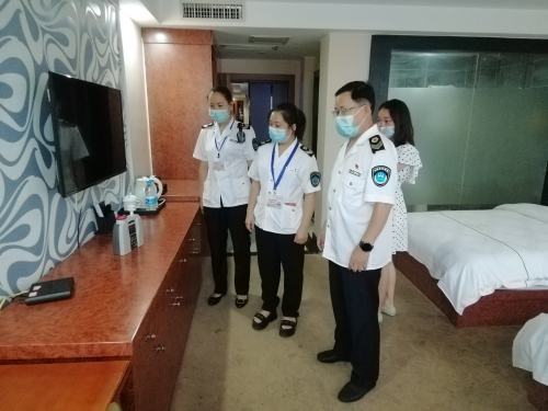卫生执法人员在考生入住酒店查看卫生防疫情况