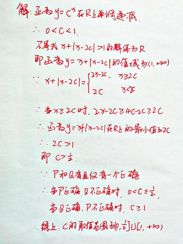 Q为真时,即不等式x+|x-2c|>1的解集为R,则等价于函数y=x+|x-2c|的值域为(1,+∞)。要求这个函数的值域,需要先去掉绝对值符号,即需要对x进行分类讨论:当x≥2c时,y=2x-2c;当x<2c时,y=2c。又x≥2c时,y=2x-2c≥4c-2c=2c,所以函数y的最小值就是y=2c,则有2c>1,即c>1/2。