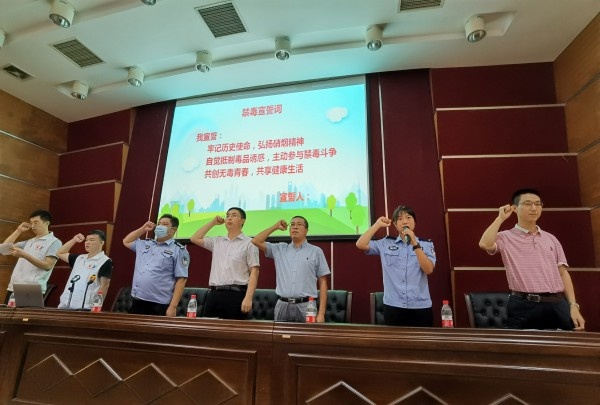 紧接着,全体师生庄严宣誓,坚决拒绝毒品,坚决与毒品作斗争。随后,坦洲镇禁毒办工作人员向全体师生介绍了毒品的品种、危害、吸毒原因,就青少年如何拒绝毒品作了重点讲解。