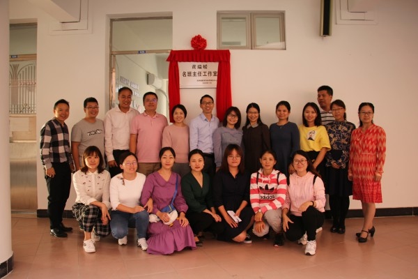 最后,三位教研员和领导一起为“阮班俊名师工作室”、“朱寿清名师工作室”、“黄瑞媛名班主任工作室”揭牌,并与主持人和工作室成员合影留念。
