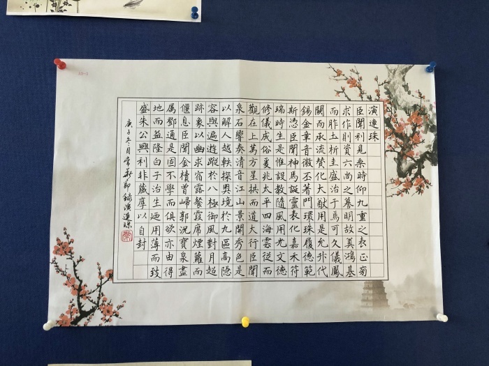 在本次书画展的布置工作中,由于书画展场地不大,给美术老师带来了较大的难度,但经过综合科组的通力合作,在李华湘主任和朱文娟老师的指导下,将学生的作品通过高低错落,层次分明的布置,呈现了立体与平面的和谐分布。