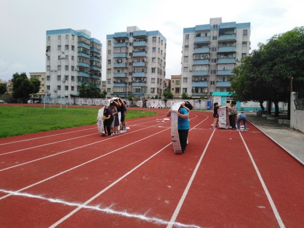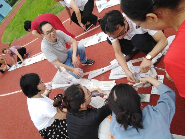 然后全体老师到达运动场开始活动。随着哨声响起,各组队员马上分工合作:有的指挥、有的折报纸、有的粘胶带。很快就做出了报纸大圆环、全组队员在圆环里面滚动到达终点。每一个环节都牵动着队员的心弦,同呼吸,共命运,彼此加油、欢呼、鼓劲,让身心得到放松。