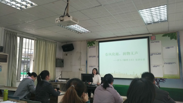 首先,黄淳怡和谢文娴两位新老师各自向老师们分享了参加班主任能力培训的学习心得。黄老师分享了电影的教育意义,鼓励老师们要多开展精神活动,促进班级成长;并从新的角度谈论了后进生的转化方式,学会赏析孩子,开发孩子的潜能,让在场老师们如沐春风。谢老师以“小活动,大德育”为题展开交流,鼓励老师们多开展班级活动,在活动中挖掘德育的素材,从而做到小多动,大德育的效果。她建议老师们多读书,因为读书能改变视野,改变品味,改变思考的方向,从而让教育教学更多元化,更有成效。谢老师的分享让在场的老师们也感受到新老师的教育激情。接着,戴水连老师分享班级特色创建的经验与心得。戴老师建议班级特色的创建选题要新颖,展示要亮点、开展要追求多元化。戴老师热心教育、追求完美的教育情怀感动所有老师,讲授时不时响起热烈的掌声。最后,与会领导分别总结了本次培训的成效和意义。