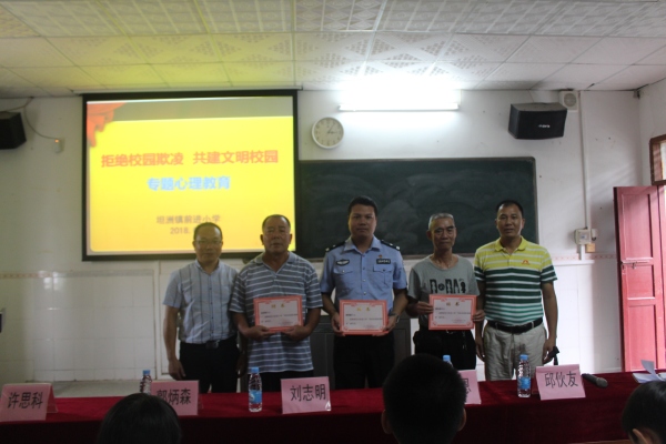 为了进一步预防校园欺事件发生,增强学生的法制观念,提高学生防范意识和保护能力,向学生提供一个良好的校园学习环境,保障学生身心健康发展,6月4日下午,坦洲镇前进小学邀请了镇永前派出所杨伟恩警官,新前进村关心下一代委员会刘志明和邱伙友两位同志,对全校师生进行了“拒绝校园欺凌,共建文明校园”专题法制教育讲座。