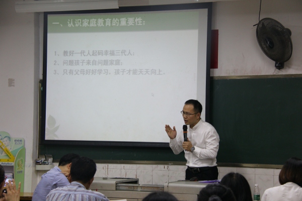 会议第一讲——家庭教育。这次家庭教育专题讲座由国家家庭教育讲师、东凤镇教育事务指导中心德育专干赖立章老师主讲。赖老师紧贴时代脉搏,通过生动的故事和鲜活的案例为家长们“把脉”,指出家长们在教育孩子中存在的误区,建议家长更新育儿观念,对家长怎样用心用智教育孩子方面进行了详细的讲授,赖老师认为“以身作则、保持良好的婚姻关系、关心孩子的学习、关注孩子的生活习惯、注重教育孩子的方法”等方面对孩子的成长有着莫大的联系。家长不但要做孩子的好伙伴、做孩子的好老师,更要学会赏识孩子的进步,学会自我提高家教方法。