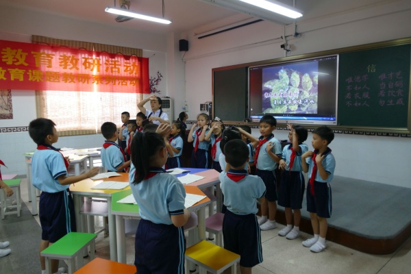 坦洲镇同胜小学梁霞老师呈现了国学特色课程《弟子规节选<信>》。课堂的开始是梁霞老师带领学生顶书静坐,营造出宁静祥和的课堂氛围。新课的教授过程梁霞老师十分注重学生对弟子规内容的理解,以多种形式让学生交流讨论并诵读。课堂中随班就读学生不时地离开座位,干扰其他学生听课,梁霞老师都是耐心十足地将其带回座位,安抚好他的情绪。在此过程中,梁霞老师还以小组合作形式让小组学生带动随班就读学生进行学习,其中手语舞蹈教学环节带动了随班就读学生更好地融入课堂教学,为随班就读学生提供了教学契机。整节课中,梁霞老师除了进行正常的教学,还时刻关注着随班就读学生的情况,梁霞老师或是用手势指导随班就读学生,或是利用教学的视频吸引随班就读学生注意力,整节课随班就读学生也十分配合梁霞老师的教学指导。