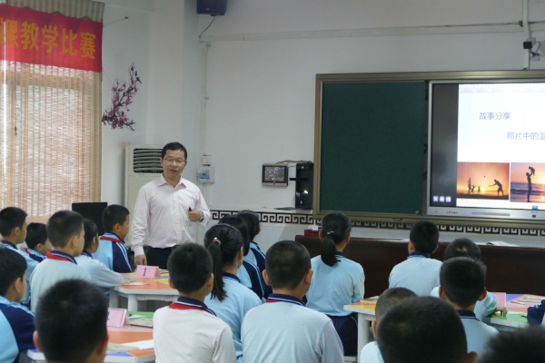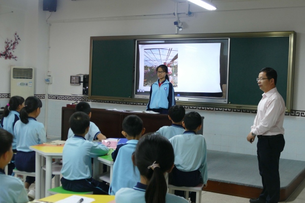 调研分为三个环节:座谈交流、课例展示、说课议课。在座谈交流中,余壁峰校长向参与调研的老师详细地介绍了学校开展中华优秀传统文化教育教学的经验与成果,得到了与会老师的充分肯定。随后,余壁峰校长执教了《论语》节选第十一课。这节课例设计得结构完整、思路清晰、内容丰富,余校长在引导学生充分诵读经典的同时,辅以相关的图片、音乐和视频,让学生充分感受到了经典的魅力与文化内涵。课后,先由余校长进行简单的说课,听课的老师均发表了自己的看法。林晓洁老师、和王建国老师均认为这是一节“高端大气上档次”的传统文化教学课例,认为余校长的课目标定位准确,触动内心,感人至深。坦洲德育专干张凯老师也说这节课充分体现了传统文化教学课的育人功能。