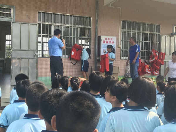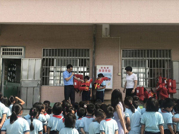 范田华校长,李少基主任代表学校接受了捐赠。范田华校长接受捐赠后向中山市神湾海事处和坦洲镇新合村的救生衣捐赠表示感谢。学生们拿着新的救生衣都非常感激,个个脸上洋溢着开心的表情。最后,中山市神湾海事处的工作人员,向学生讲授穿救生衣和防护知识,渡船安全的注意事项,防溺水,溺水后如何自救等安全知识进行详细的讲解,并为师生进行现场演示。学生都积极地参与到渡船实操安全演练中。