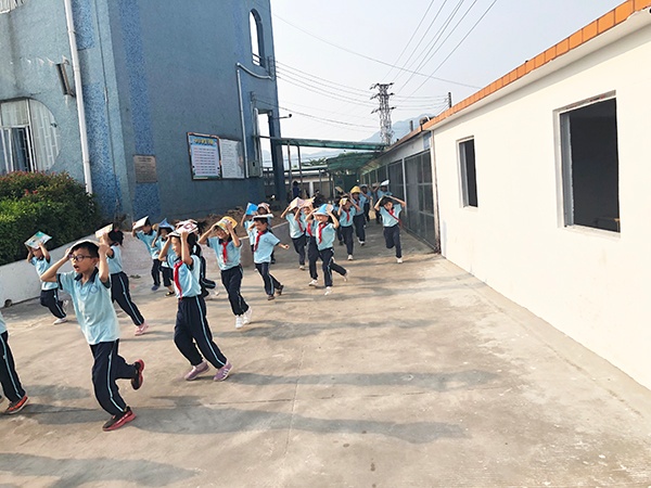 随着一阵尖锐而又急促的警报声响起,所有班级学生在老师指挥下,或手拿书本或手拿书包护住头,弯腰迅速、有序、安全地从教室向操场撤退。全校师生按预定的疏散路线迅速撤离到指定地点,用时1分钟11秒,整个活动紧张、安全、有序。